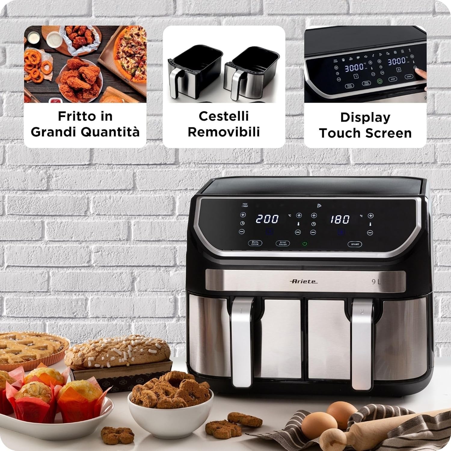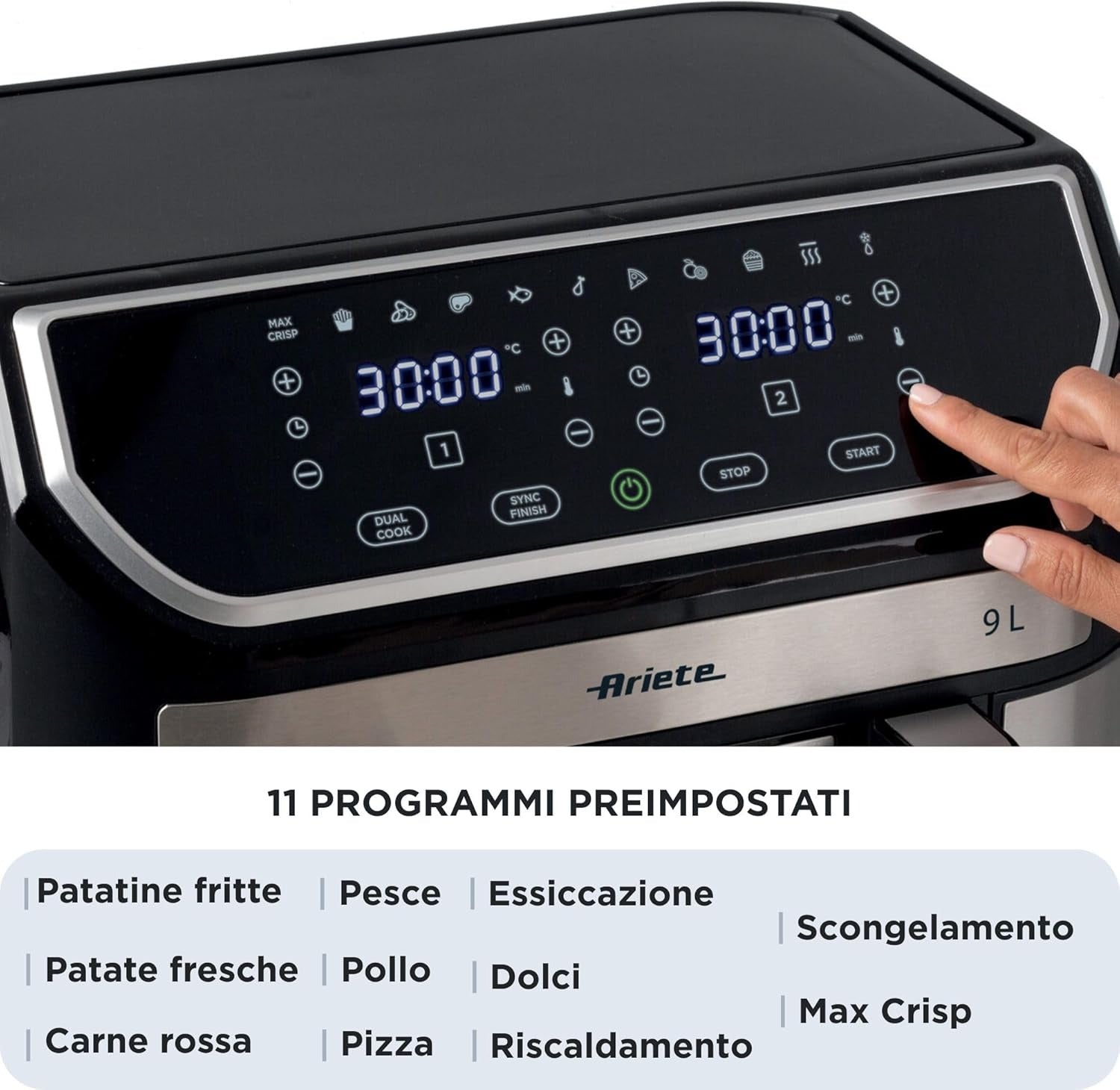 Ariete Friggitrice ad aria 9L, 2100W, Capacità 9L, Doppio cestello, Capacità di cottura 3,6kg, 11 programmi preimpostati, Funzione Max Crisp, Temperatura fino a 200°C, Cestello antiaderente con
